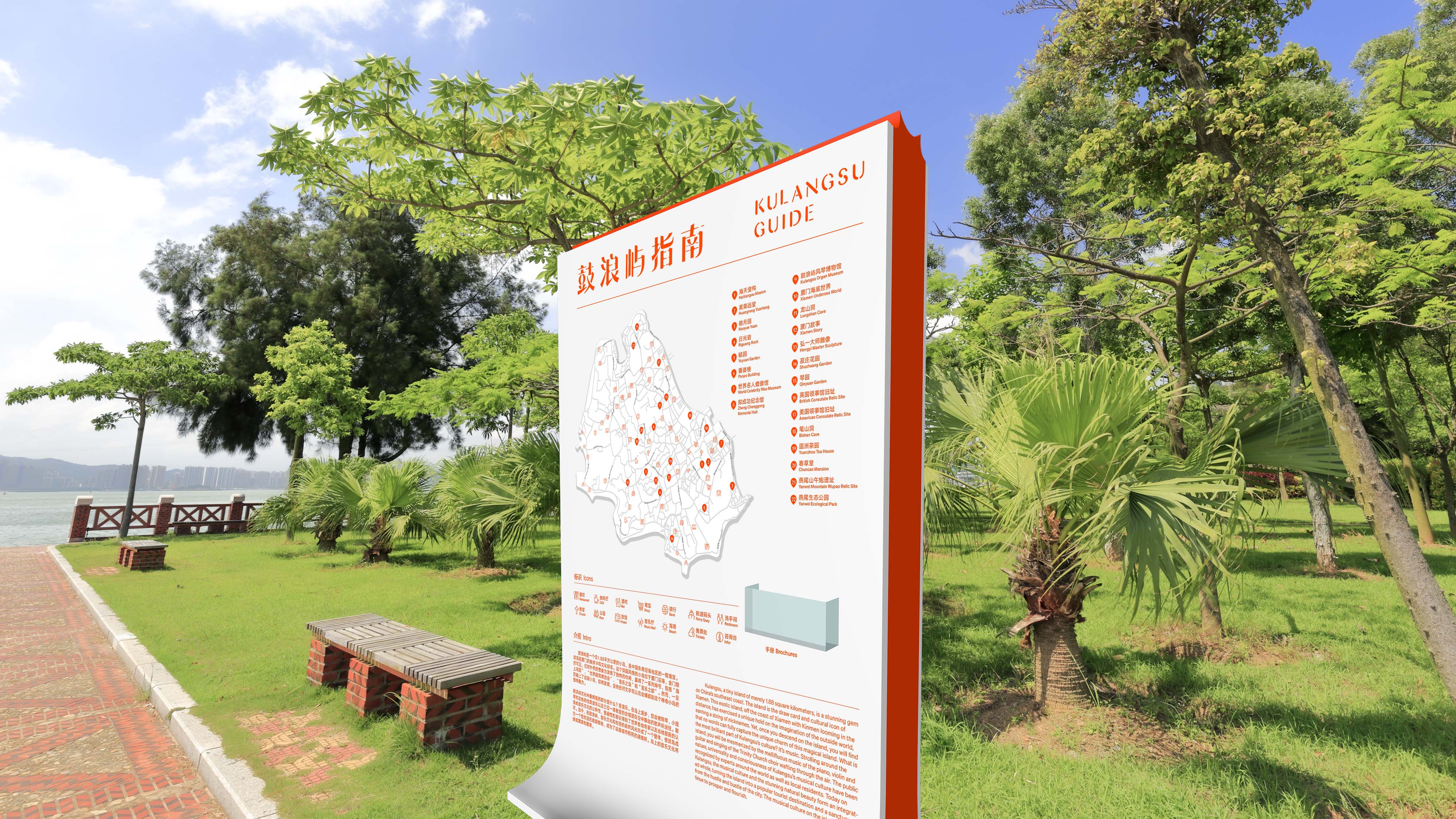 Kulangsu is a pedestrian-only island off the coast of Xiamen, in southeastern China. Kulangsu is renowned for its beaches, winding lanes, and rich architecture. It is a major domestic tourist destination, attracting millions of visitors every year. The breaking lines in both two typefaces show the feeling of water waves. The shape of the signages' top and curve bottom is from the traditional buildings’ roof of Min-nan architectures.